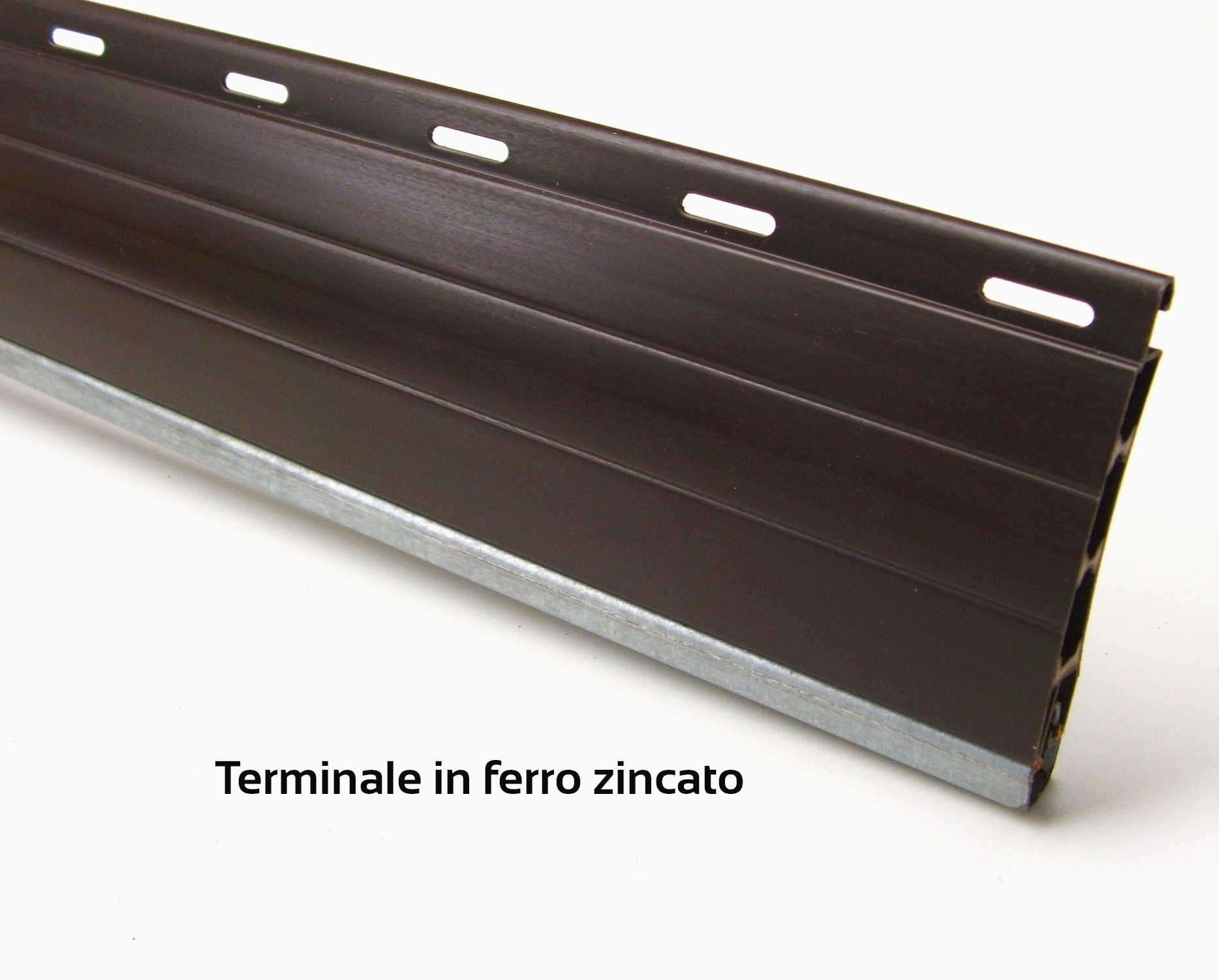 Terminale standard con battuta in ferro zincato. Su richiesta Terminale in alluminio. Dimensioni profilo: 14 x 55mm